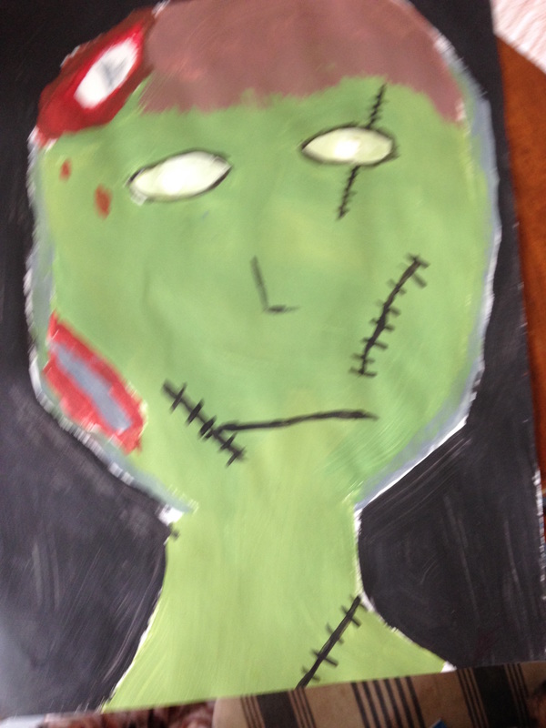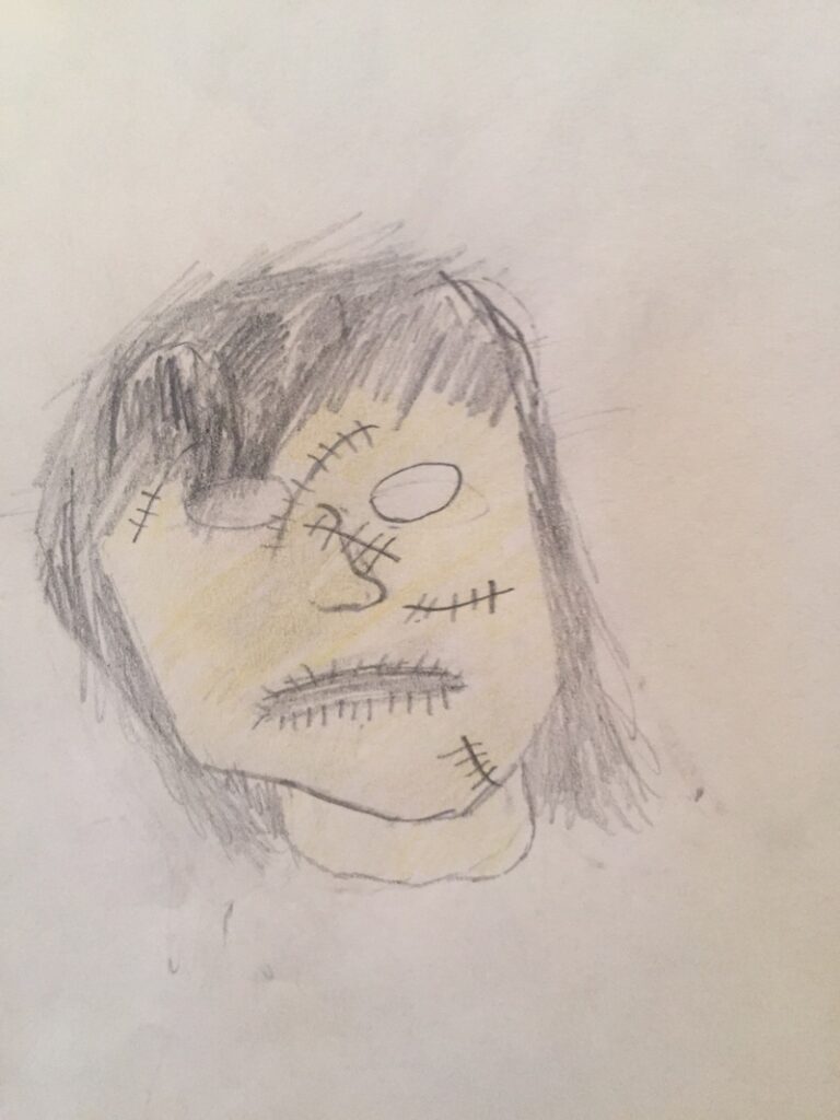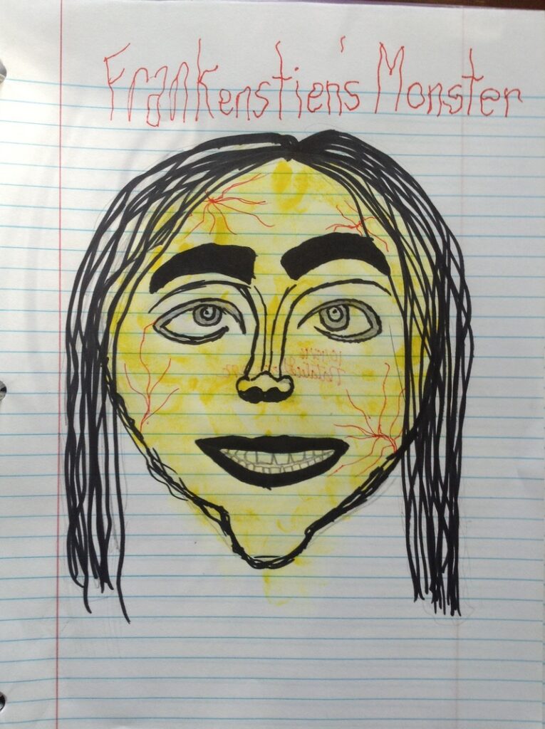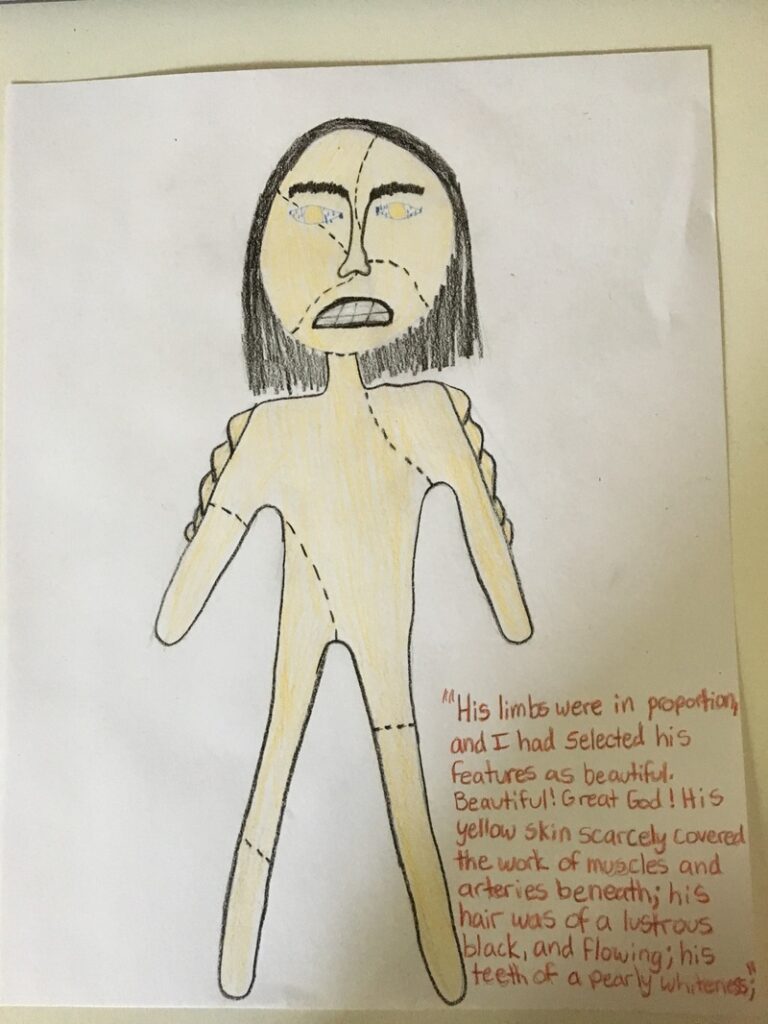 We closed our final class on Frankenstein with a quick look at both the classic Boris Karloff 1931 black and white film, and the more recent (1994) film directed by Kenneth Branagh starring Robert DeNiro. In the 1931 film, the creature is depicted as having a huge, square skull and pale corpse-like skin; he is gentle and childlike. In the more recent adaptation, makeup artists researched surgery, skin disorders, and embalming techniques from the early 1800’s. The result was a gray, scarred, hulking, patchwork sort of man. After a discussion about Doppelgängers (Double Goers) we revealed our OWN interpretations of Mary Shelley’s creature (taken from her description in chapter 5). I share them with you here. Wonderful job everyone!
